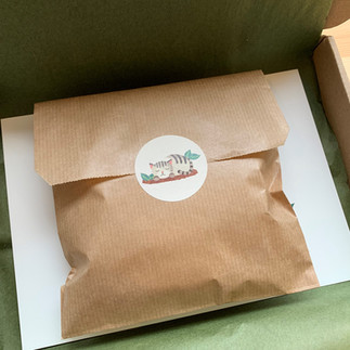 We willen natuurlijk niet dat het schaaltje stuk gaat, dus ik verpak het in bubbeltjesplastic. Daarna gaat het in een kraftpapieren zakje, wat ik afsluit met een poezensticker (die past bij de illustratie!).